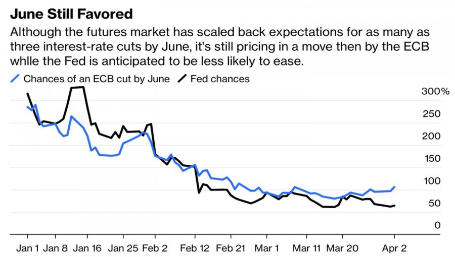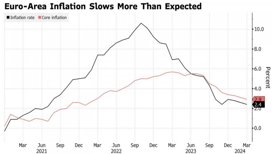 Цель по европейской инфляции 2% все ближе, что заставляет инвесторов рассуждать о более раннем снижении ставки по депозитам ЕЦБ, чем в настоящее время прогнозирует срочный рынок. В марте потребительские цены в еврозоне замедлились с 2,6% до 2,4%, базовая инфляция – с 3,1% до 2,9% г/г, ниже консенсус-прогнозов экспертов Bloomberg. Но вместо того чтобы упасть, котировки EUR/USD продолжили идти на север. «Быки» настолько упрямые? Или покупатели отключили разум?