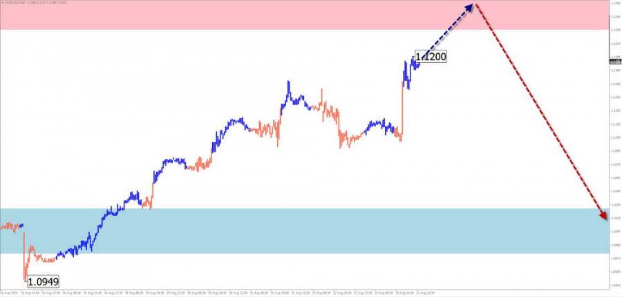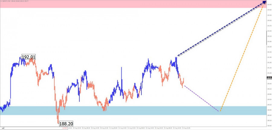 В начале недели на графике евро ожидается продолжение ценового подъема, вплоть до границ зоны сопротивления. Во второй половине можно ждать рост волатильности, разворот и начало коррекции курса пары. Нижней границей вероятного недельного диапазона хода выступает зона поддержки.