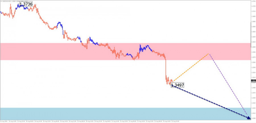 Направление краткосрочного тренда с начала августа текущего года задаётся восходящей волной. Всю прошедшую неделю цена перемещалась в боковом дрейфе вдоль расчётной поддержки, формируя коррекцию (В). На момент анализа ее структура не выглядит завершённой.
