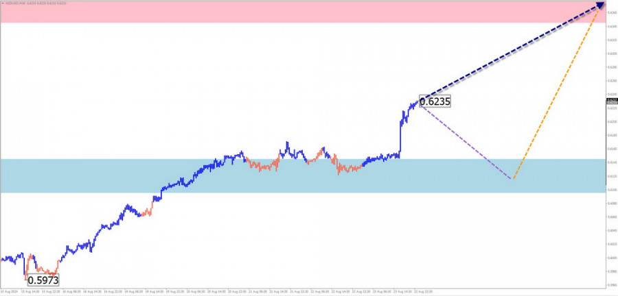 Мажор новозеландского доллара продолжает своё движение по восходящему направлению, стартовавшему в апреле. Незавершённый участок по основному курсу ведёт отчёт с конца июля. Котировки преодолели верхнюю границу промежуточной зоны потенциального разворота.