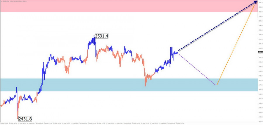 Направление ценового движения золота с октября прошлого года задаётся восходящей волной. В краткосрочной перспективе курс движения задает незавершённая бычья волна от 3 августа. Цена продавила нижний рубеж предварительной целевой зоны всей текущей волны, совпадающей с уровнем мощной зоны потенциального разворота. В последние недели котировки образуют откат.