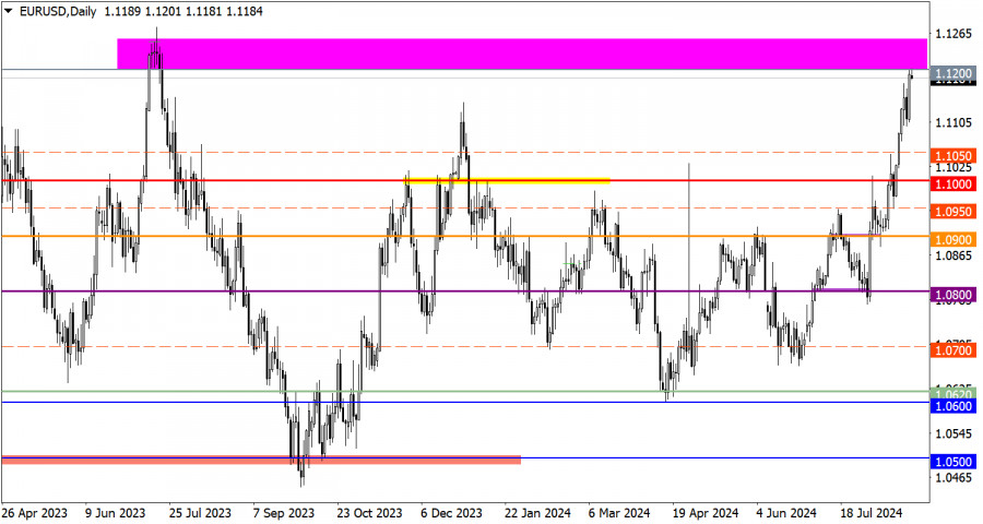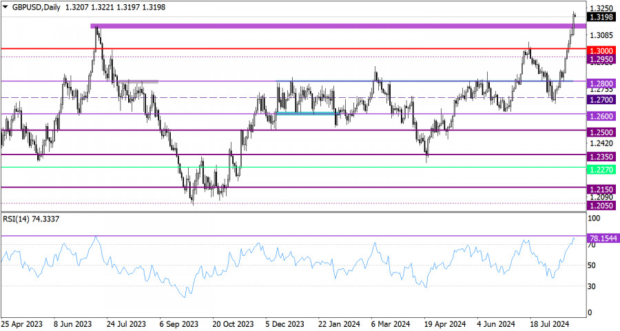 • GBP/USD: Валютная пара GBP/USD не только сохранила восходящий тренд, но и продлила его, обновив локальный максимум, установленный в июле 2023 года. Это свидетельствует о продолжении уверенного роста фунта стерлингов и поддерживает текущую бычью динамику на рынке.