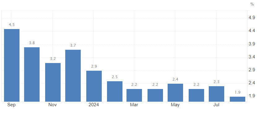 Годовой уровень инфляции в Германии снизился до 1,9% в августе 2024 года, что ниже прогнозов в 2,1%, по сравнению с 2,3% в июле, показали предварительные оценки. Это был самый низкий показатель с марта 2021 года.