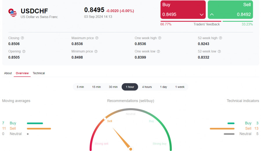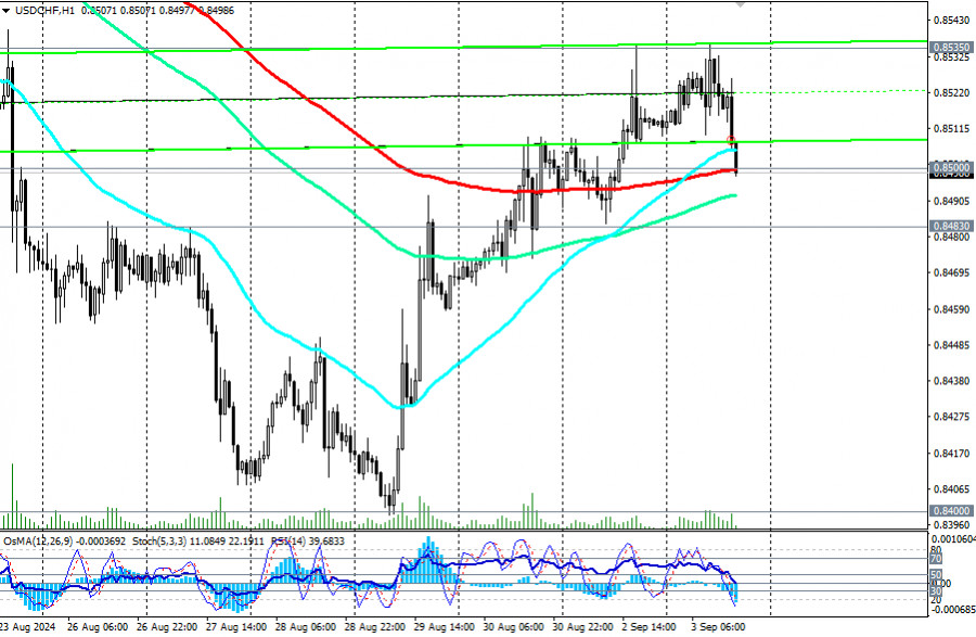 С технической же точки зрения для возобновления коротких позиций по паре USD/CHF ей необходимо пробить уровень поддержки 0.8500. В целом же USD/CHF торгуется в зоне медвежьего рынка, что тоже отдает предпочтение коротким позициям (подробнее и альтернативный сценарий см. в «USD/CHF: торговые сценарии на 03 – 06.09.2024»).