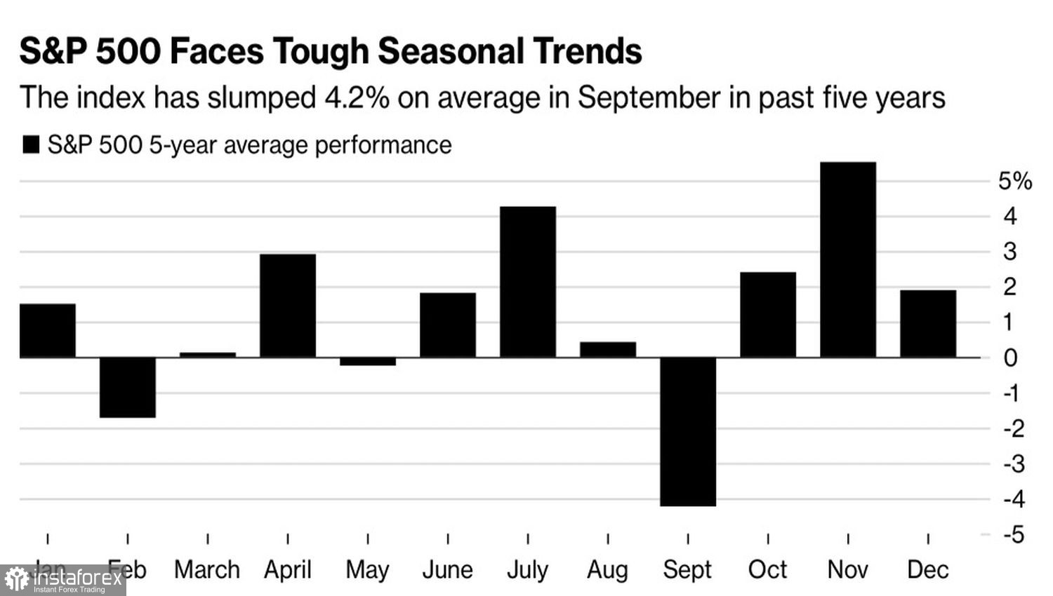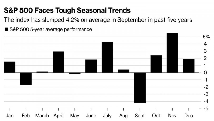 Если прибавить к этому неблагоприятный для S&P 500 сентябрь, картина для «медведей» и вовсе пишется маслом. За последние пять лет широкий фондовый индекс терял в среднем более 4% своей стоимости. Также отрицательные для него февраль и май не идут в сравнения с этой цифрой.