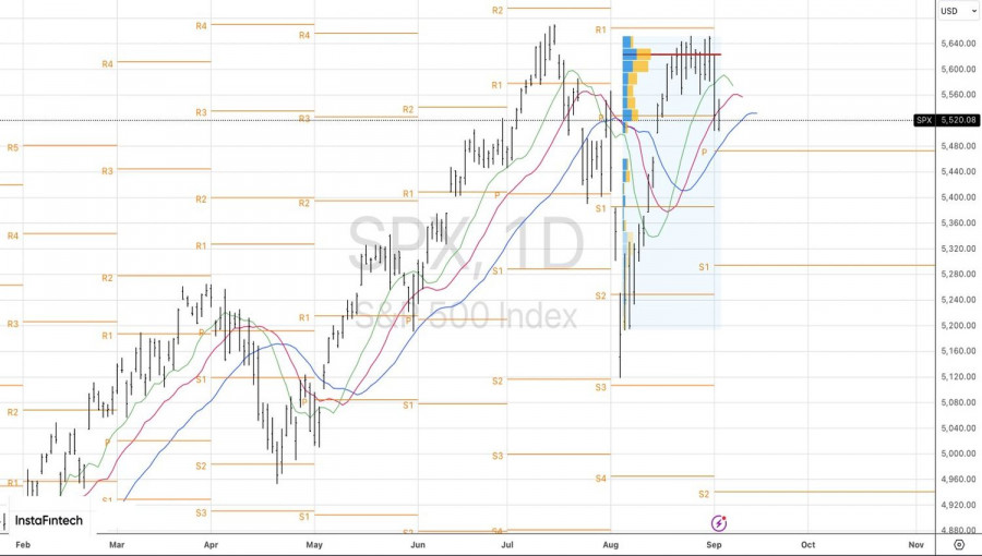 Технически на дневном графике S&P 500 был сформирован паттерн Двойная вершина. Падение котировок ниже справедливой стоимости и двух из трех скользящих средних из Аллигатора говорит о серьезности намерений «медведей». Пока индекс держится ниже 5530, имеет смысл его продавать. В качестве целевых ориентиров по шортам выступают отметки 5395 и 5290.