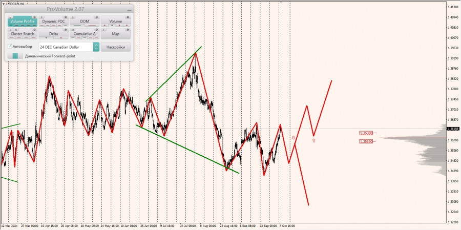 Долгосрочная тенденция: в шорт. Максимальное скопление объемов текущего контракта расположено в диапазоне по котировкам 1.35650-1.36000. В настоящий момент по паре совершаются инвестиционные операции выше, указывая на слабость продавцов.