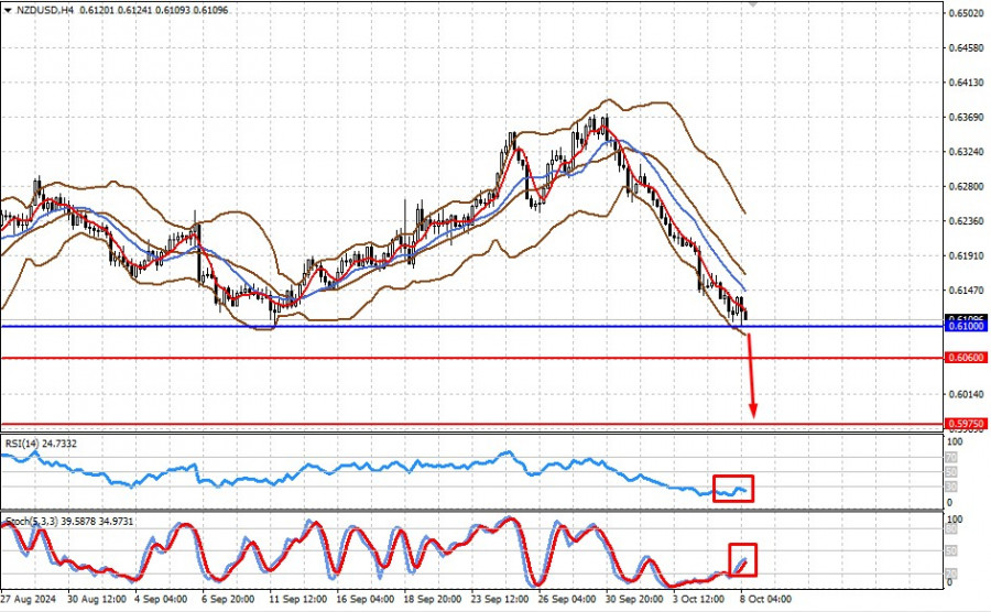 Пара падает на фоне локального усиления позиций доллара США, а также прогноза понижения ставки в Новой Зеландии, где предполагается ее срезание сразу на 0.50%, с 5.25% до 4.75%. Исходя из этого, можно ожидать падения пары сначала к 0.6060, а затем и к 0.5975, после снижения ниже отметки 0.6100.
