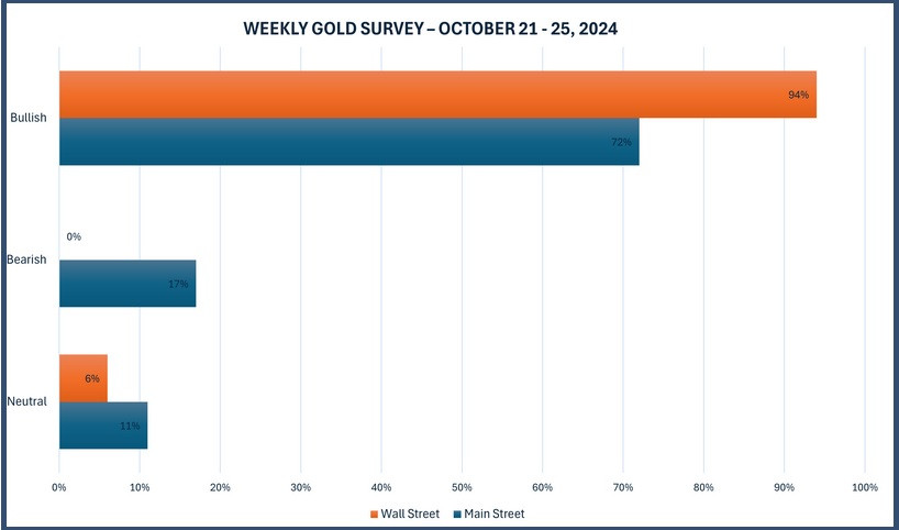 В онлайн-опросе было отдано 159 голосов, и подавляющее большинство инвесторов Main Street вновь присоединилось к бычьим настроениям. 115 розничных трейдеров, которые составили 72%, ожидают роста цен на этой неделе. 27, или 17%, в ожидании снижения цен. Остальные 17, составляющие 11% от общего числа, считают, что золото будет находиться в консолидации.