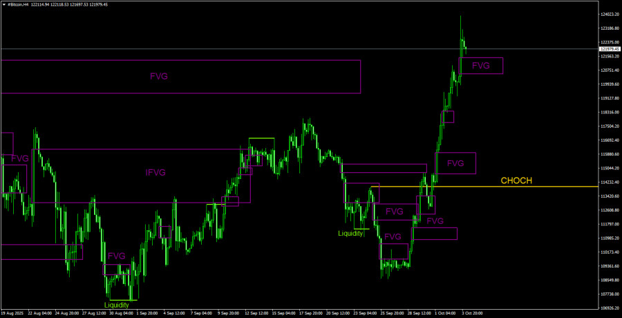 На 4-часовом таймфрейме проводить анализ сейчас не имеет никакого смысла. Цена летит вверх со скоростью света, не обращая внимания на паттерны и формируя пачками «бычьи» FVG. Формально, если вы все также настроены на покупки, можно использовать эти паттерны для открытия длинных позиций. Только вот цена даже минимальных коррекций не формирует. Открывать длинные позиции в большинстве случаев неоткуда.