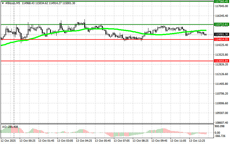 Сценарий №2: покупать биткоин можно от нижней границы $114 600 при отсутствии рыночной реакции на ее пробой в обратную сторону к уровням $115 700 и $117 300.