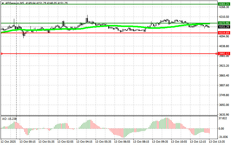 Сценарий №2: покупать эфир можно от нижней границы $4114 при отсутствии рыночной реакции на ее пробой в обратную сторону к уровням $4172 и $4283.