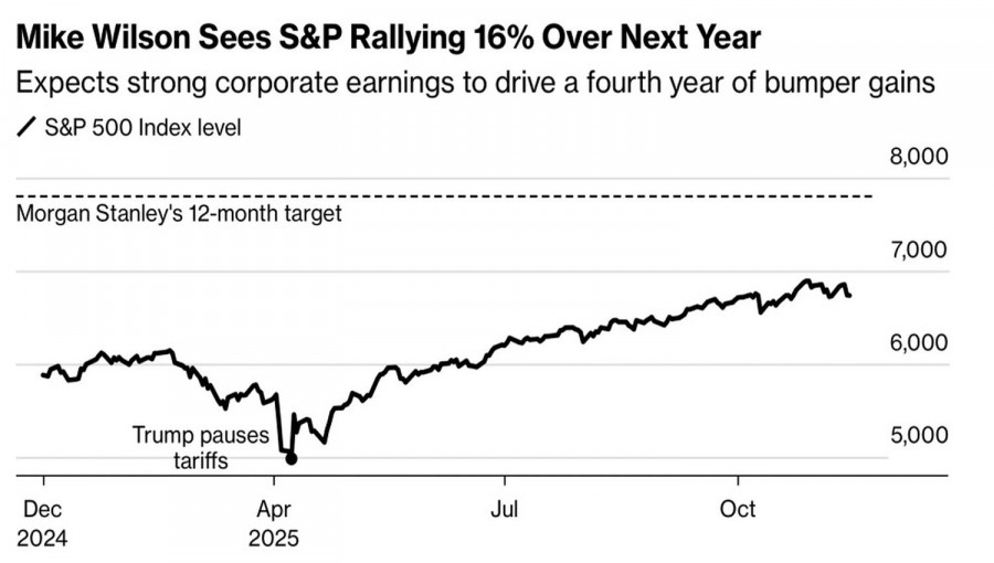 Несмотря на сигналы о возможном переходе рынка на территорию «медведей», оптимисты не перевелись. Morgan Stanley выставляет один из самых «бычьих» прогнозов на Уолл-стрит о росте S&P 500 до 7800 к концу 2026. Он предполагает, что широкий фондовый индекс отметится четвертым подряд годовым двухзначным приростом.