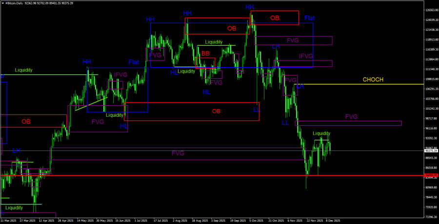 Напомним, что многие криптоаналитики ожидают продолжения падения биткоина. Тяга к риску среди институциональных инвесторов падает и даже MicroStrategy допускает возможные продажи биткоина из-за нехватки ликвидности. ФРС могла анонсировать вчера смягчение монетарной политики в 2026 году, но предпочла этого не делать. Поэтому, как минимум, в первой половине следующего года рассчитывать на новое снижение ключевой ставки не стоит. Конечно, все будет зависеть теперь от инфляции в США. Если она начнет двигаться к 2%, а не от 2%, тогда ФРС рассмотрит возможность нового смягчения, что хорошо для криптовалютного рынка. Но на ближайшие месяцы ФРС биткоину – не помощник. Быкам крайне сложно даже в рамках коррекции продвигать «цифровое золото» вверх, поэтому мы, как и раньше, ждем нового падения.