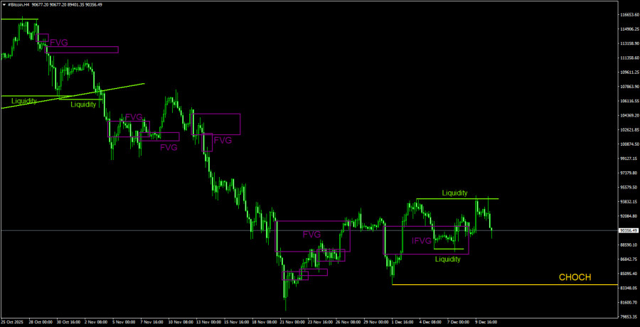 На 4-часовом таймфрейме техническая картина также однозначно указывает на нисходящий тренд, но в данное время продолжается коррекция с собственной структурой. Линия CHOCH(слом тренда) проходит на уровне 83 730$, но она сейчас неважна, так как очевидно, что нисходящий тренд сохраняется. Последний «бычий» IFVG был отработан и дал реакцию цены. Реакция оказалась слабой, этот сигнал уже может быть отработан, а все, на что хватило сил у быков – это снятие ликвидности на продажу с предыдущего максимума. Таким образом, с технической точки зрения, падение может возобновиться в любой момент.