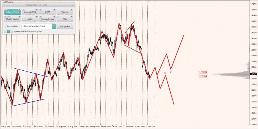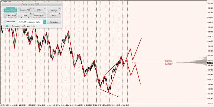 Область выгодных цен на покупку с точки зрения маржинального обеспечения располагается между зонами 1/4 и 1/2, построенными от максимума 11.12.2025.