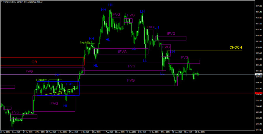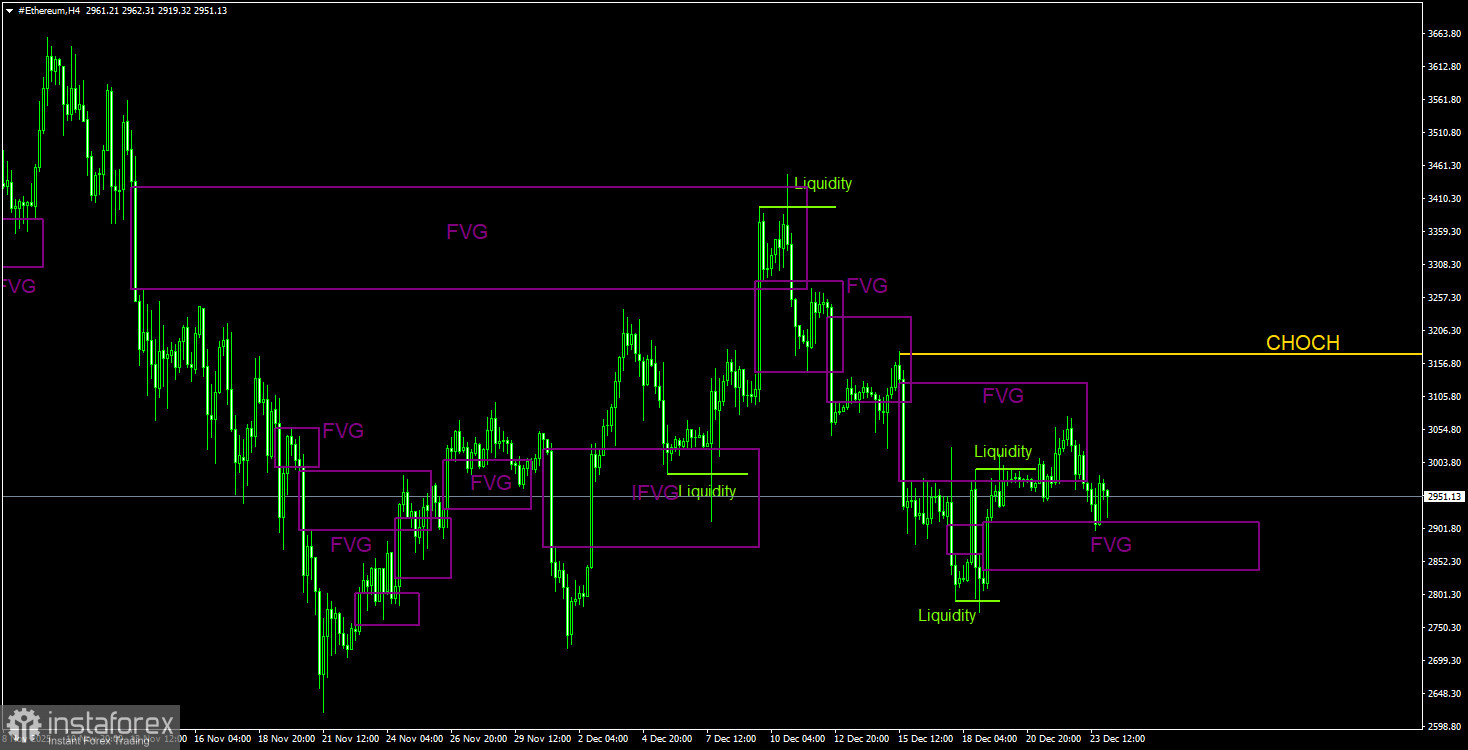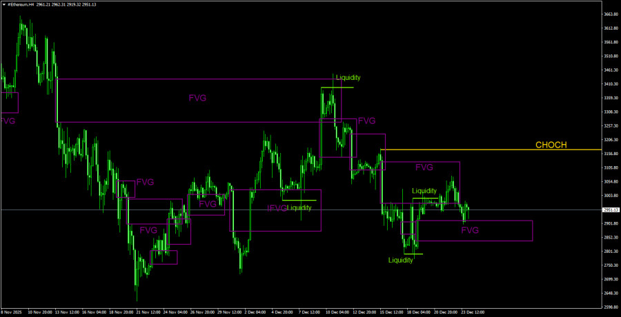 Эфир уже несколько дней подряд практически обездвижен. Что это? Праздничный флэт? Так или иначе, но понижательные перспективы сохраняются перед криптовалютой и перед всем криптовалютным рынком. Биткоин уже около недели торгуется в очередном флэте. В преддверии праздников волатильность на криптовалютном рынке снизилась, но периоды затишья и простоя случаются на любом рынке. Практически на всех таймфреймах предостаточно «медвежьих» сигналов, паттернов и структур. Напомним, что все началось с двух снятий ликвидности с ATH по биткоину. Первая криптовалюта начала падать, поэтому начал падать и весь криптовалютный рынок. Эфир, в свою очередь, также снял ликвидность со своего ATH, сформировал «медвежий» Order-block на недельном ТФ, получил реакцию на него и с тех пор тоже только падает. На дневном графике эфир получил реакцию от последнего FVG, на 4-часовом ТФ структура нисходящая. Таким образом, в данное время нет ни одного технического признака роста.