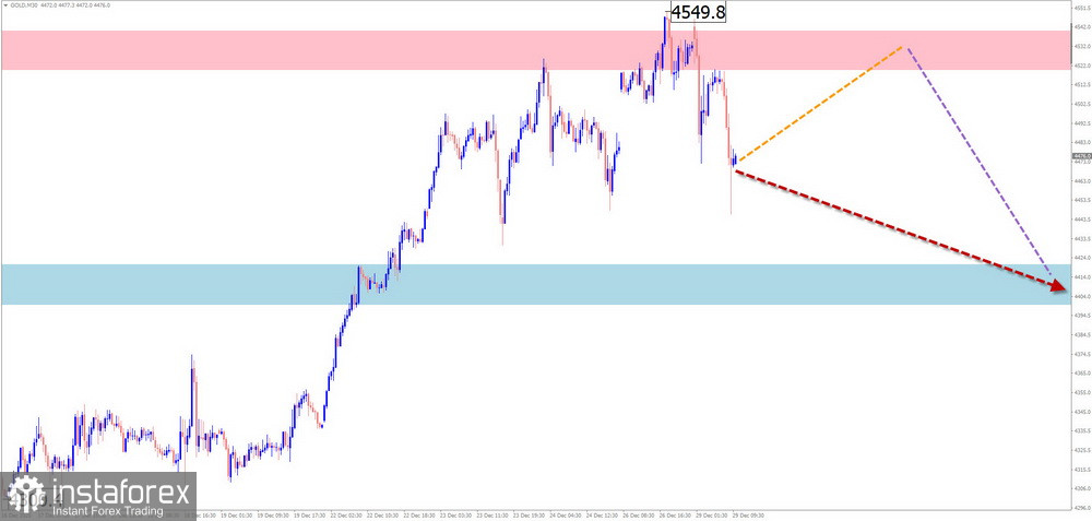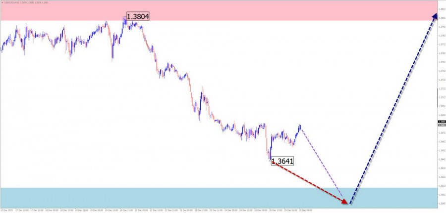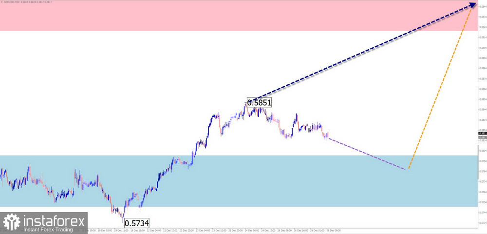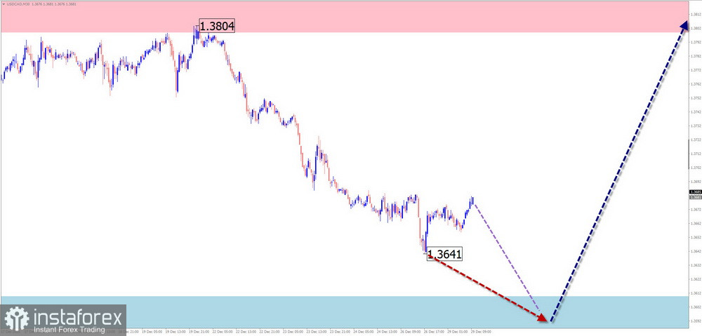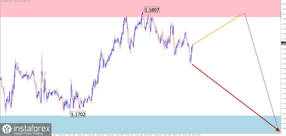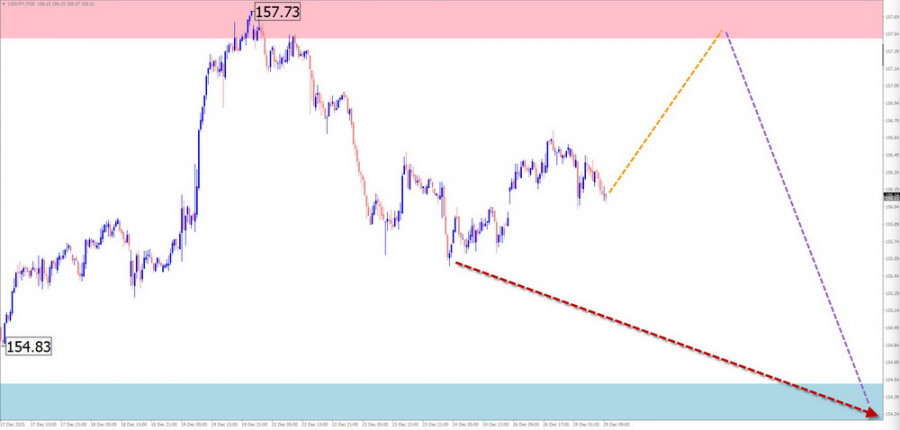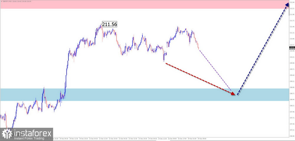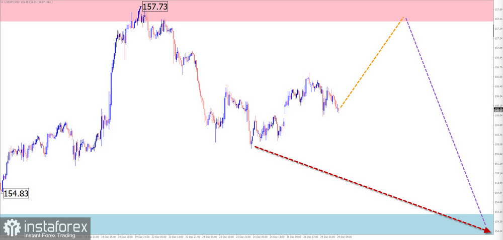 На графике основной пары японской йены с начала августа формируется восходящая волна. Навстречу основному курсу с начала октября развивается скрытая коррекция, в виде растянутой/сдвигающейся плоскости. В структуре не хватает заключительной части (С). Нисходящее движение от 22 декабря обладает разворотным потенциалом.