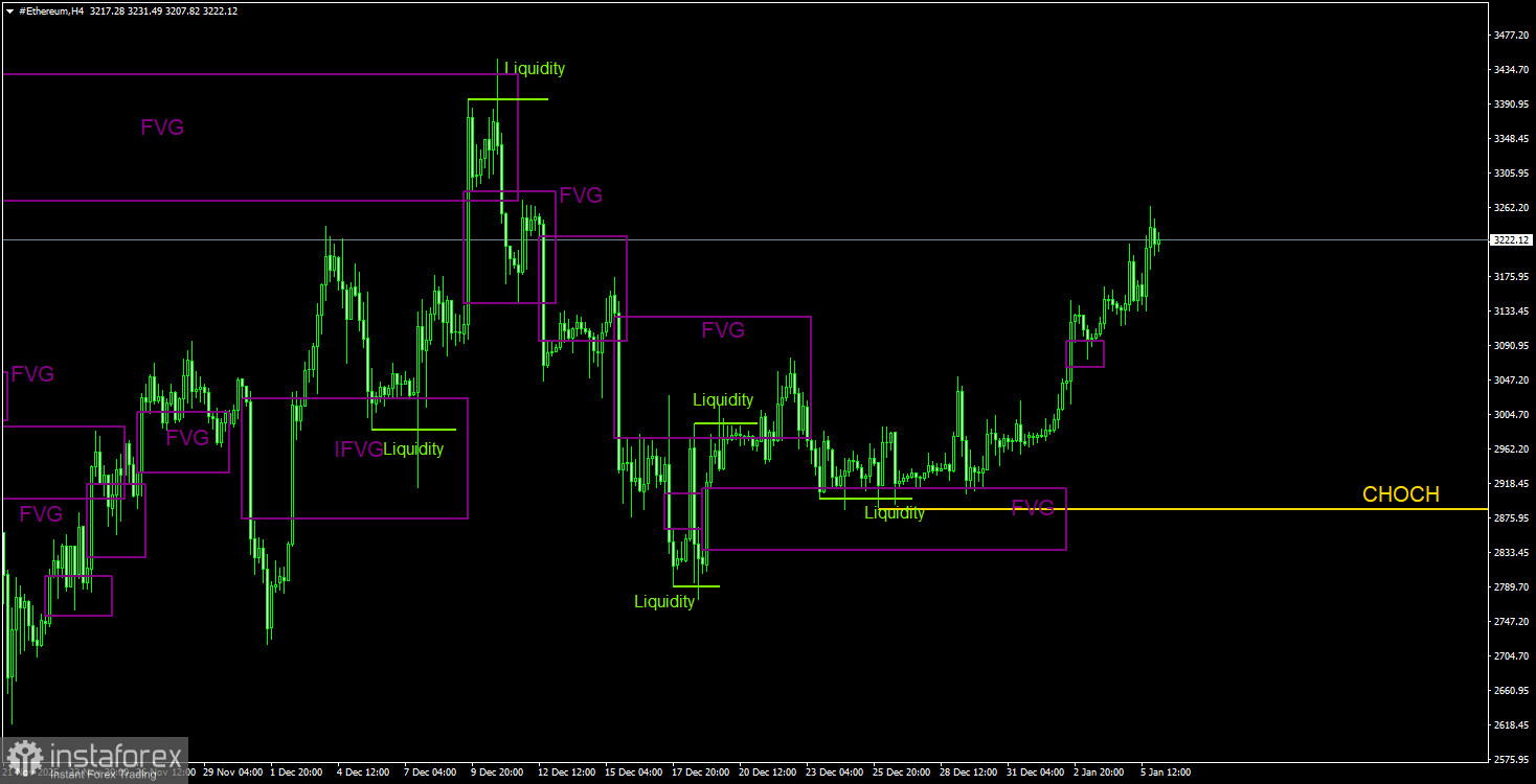На дневном ТФ продолжается формирование нисходящей тенденции. Ключевым паттерном на продажу выступал и выступает «медвежий» Order-block на недельном ТФ. Движение, спровоцированное этим сигналом, должно быть сильным и длительным. Коррекция на криптовалютном рынке может быть завершена. Не факт, что тренд возобновится по биткоину/эфиру из «медвежьего» FVG на дневном ТФ, но это область, в которой открытие коротких позиций было целесообразным. На 4-часовом ТФ криптовалюта может в любой момент начать новый виток падения, но сигналов на продажу и новых «медвежьих» паттернов пока нет. Цели падения – 2 717$ и 2 618$ – остаются актуальными. И это лишь самые ближайшие цели. Потенциал падения эфира – гораздо выше.