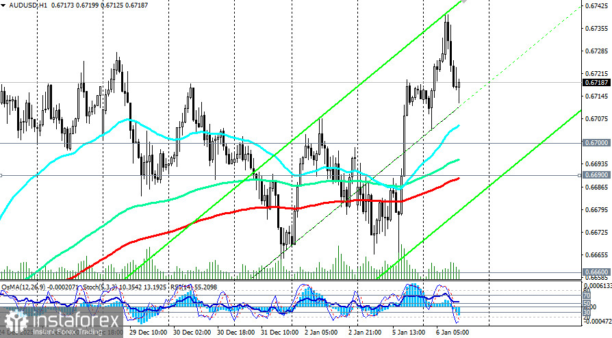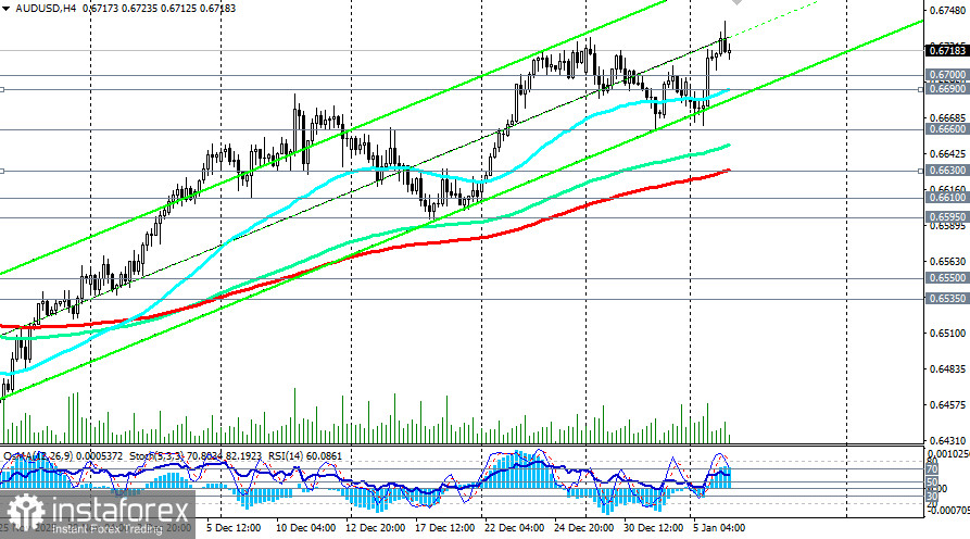 В альтернативном сценарии цена перейдет к коррекции, старт которой может дать завтрашняя публикация австралийских CPI (если они окажутся слабыми), а сигналом – последовательный пробой цены открытия сегодняшнего дня 0.6713, минимума сегодняшнего дня 0,6704 и «круглой» отметки 0.6700. Цель коррекции – ключевой долгосрочный уровень поддержки 0.6660. В случае его пробоя цена может снизиться к зоне поддержки вокруг важных уровней 0.6635 (ЕМА200 на 4-часовом графике), 0.6610 (ЕМА50 на дневном графике).