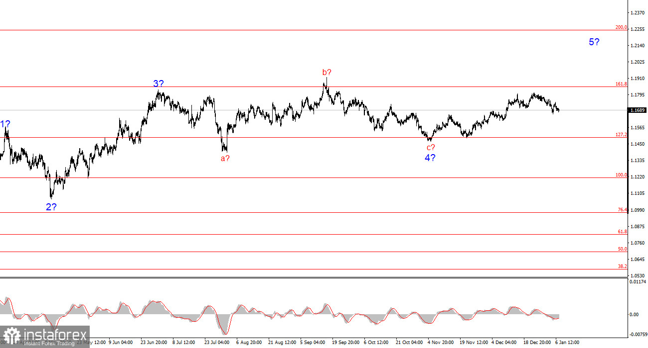 Волновая разметка 4-часового графика для инструмента EUR/USD имеет вполне понятный, хоть и довольно сложный вид в последние месяцы(нижняя картинка). Об отмене повышательного участка тренда, который берет свое начало в январе прошлого года, речи не идет, но волновая структура, начиная с 1 июля 2025 года, приняла сложный и протяженный вид. На мой взгляд, инструмент завершил построение коррекционной волны 4, которая приняла очень нестандартный вид. Внутри этой волны мы наблюдали исключительно коррекционные структуры, поэтому сомнений в коррекционном характере этой волны не возникает никаких.