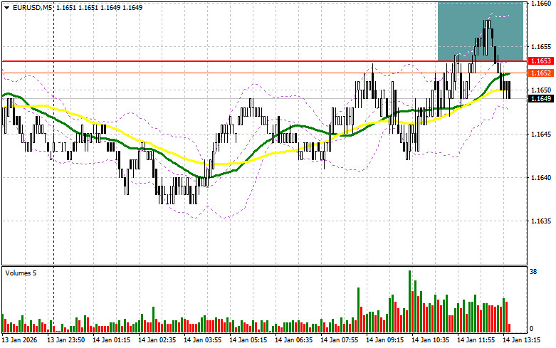 В своем утреннем прогнозе я обращал внимание на уровень 1.1653 и планировал от него принимать решения по входу в рынок. Давайте посмотрим на 5-минутный график и разберемся с тем, что там произошло. Рост и формирование ложного пробоя в районе 1.1653 привели к точке входа на продажу евро, но до крупного падения пары дело так и не дошло. На вторую половину дня техническая картина не пересматривалась.Для открытия длинных позиций по EURUSD требуется:Отсутствие статистики по еврозоне сказалось на волатильности пары EUR/USD, что