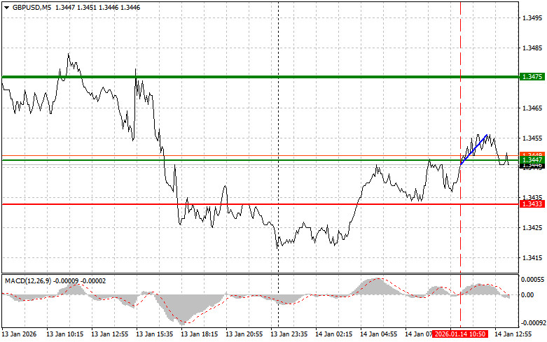 Разбор сделок и советы по торговле британским фунтомТест цены 1.3447 пришелся на момент, когда индикатор MACD только начинал движение вверх от нулевой отметки, что стало подтверждением правильной точки входа на покупку фунта. В результате пара выросла лишь на 9 пунктов, и на этом бычий потенциал иссяк. Выступление представителя Банка Англии Алана Тейлора не повлияло на британский фунт. Рынок остался равнодушным к умеренно оптимистичным заявлениям чиновника, предпочитая выжидать более весомых катализаторов для движения. Несмотря на попытки аналитиков найти в словах Тейлора