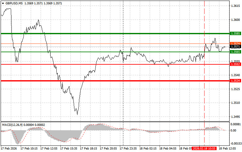 Разбор сделок и советы по торговле британским фунтомТест цены 1.3565 пришелся на момент, когда индикатор MACD много прошел вверх от нулевой отметки, что ограничивало восходящий потенциал пары. По этой причине я не покупал фунт.Фунт стерлингов продемонстрировал незначительный рост, отреагировав на опубликованные данные по инфляции в Великобритании. В отчете было сказано, что базовый индекс потребительских цен в январе составил 3,1%, что оказалось чуть выше прогнозов экономистов, ожидавших снижения показателя до 3,0%. Это может означать, что Банк Англии будет вынужден сохранять жесткую