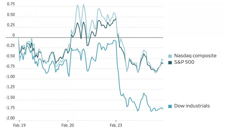 Ротация сделала рынок настолько нервным, что один пост в социальных сетях может вызвать большие колебания, чем эскалация геополитического конфликта на Ближнем Востоке или отмена тарифов Дональда Трампа Верховным судом. Искусственный интеллект – это «бычий» фактор для экономики США или «медвежий»? Или он настолько «бычий», что становится «медвежьим»? Ставшие вирусными рассуждения Citrini Research обрушили котировки S&P 500. Динамика американских фондовых индексов Десятилетиями интеллект человека был одной из причин, по которой деньги лились рекой