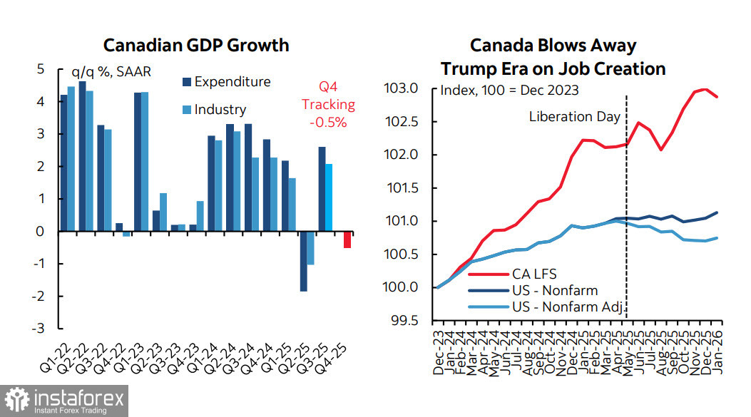 Надо признать, что четвертый квартал в Канаде оказался слабым, темпы роста реального потребления 0.6% г/г, что ниже тренда, и не ожидается, что в 1 квартале ситуация может заметно улучшиться. Отмечается сильное давление на сектор автомобилестроения, в первую очередь это связано с падением импорта в США после введения повышенных тарифов, и пока неясно, изменится ли что-то после решения Верховного суда. Если Трамп реализует свое намерение перенести тарифную политику на другое законодательное основание, то не исключено, что Верховный суд вновь рассмотрит этот вопрос и дело осложнится тем, что произойдет это ближе к промежуточным выборам, здесь Трамп рискует потерпеть оглушительное поражение.
