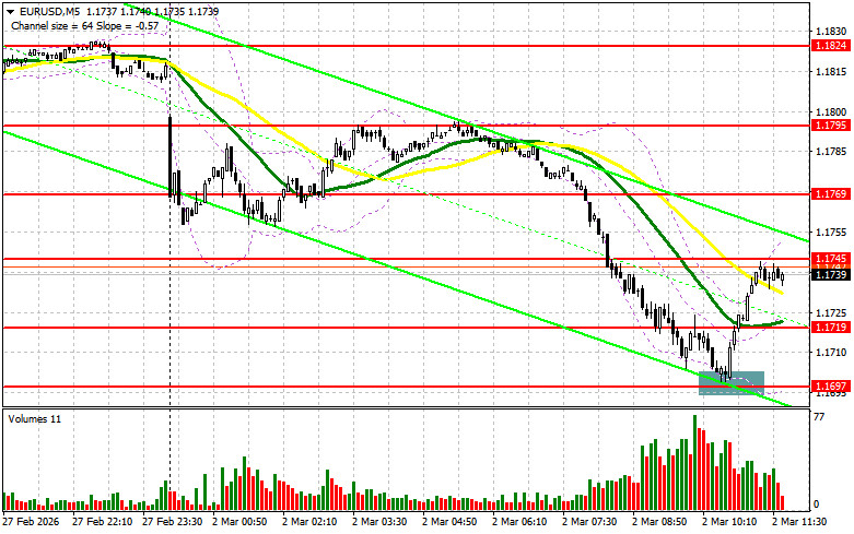 В своем утреннем прогнозе я обращал внимание на уровень 1.1697 и планировал от него принимать решения по входу в рынок. Давайте посмотрим на 5-минутный график и разберемся с тем, что там произошло. Снижение и формирование ложного пробоя в районе 1.1697 привели к точке входа на покупку евро, что вылилось в рост пары на 50 пунктов. На вторую половину дня техническая картина была пересмотрена.Для открытия длинных позиций по EURUSD требуется:Евро рухнул на фоне сообщений о том, что Германия серьезно рассматривает возможность