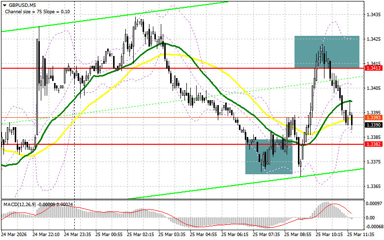 В своем утреннем прогнозе я обращал внимание на уровень 1.3413 и планировал от него принимать решения по входу в рынок. Давайте посмотрим на 5-минутный график и разберемся с тем, что там произошло. Рост и формирование ложного пробоя в районе 1.3413 привели к точке входа на продажу фунта, что вылилось в падение пары на 25 пунктов. На вторую половине дня техническая картина была пересмотрена.Для открытия длинных позиций по GBP/USD требуется: Новости о том, что индекс потребительских цен Великобритании уже в феврале
