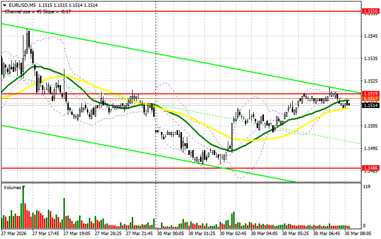 В прошлую пятницу была образована лишь одна точка входа в рынок. Давайте посмотрим на 5-минутный график и разберемся с тем, что там произошло. В своем утреннем прогнозе я обращал внимание на уровень 1.1519 и планировал от него принимать решения по входу в рынок. Снижение и формирование ложного пробоя в районе 1.1519 привели к точке входа на покупку евро, но до роста пары дело так и не дошло. Во второй половине дня я и вовсе не увидел подходящих условий для торговли.Для