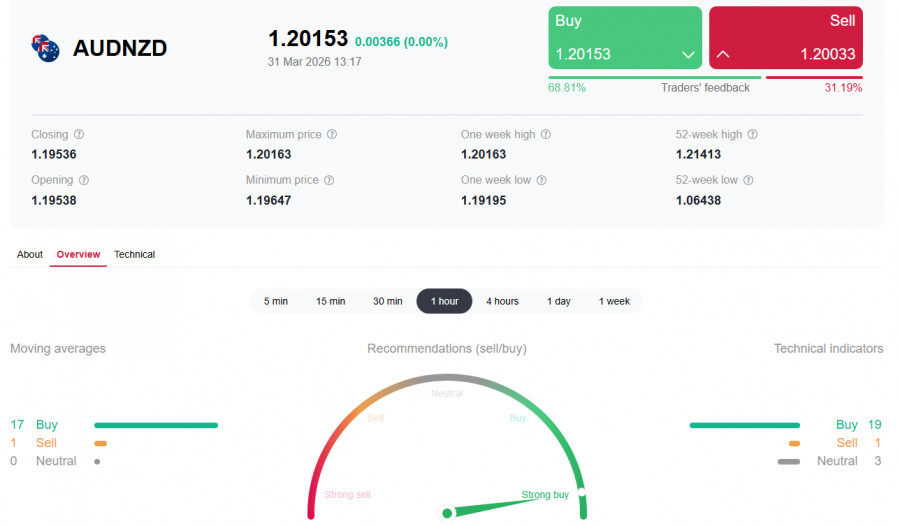 * см. также: Торговые индикаторы InstaForex по AUD/NZD Пара AUD/NZD завершает первый квартал 2026 года на уверенно бычьей ноте, торгуясь в районе 1.2000-1.2020 после публикации протоколов мартовского заседания Резервного банка Австралии и заявлений президента США о готовности завершить войну с Ираном. Австралийский доллар продолжает укрепляться по отношению к новозеландскому на фоне кардинального расхождения в монетарной политике двух центробанков, усиленного энергетическим кризисом и геополитической турбулентностью. Текущая ситуация: AUD удерживает лидерство Утренний рост пары был поддержан улучшением