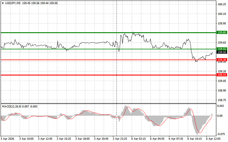 Сценарий №2: покупать USD/JPY сегодня также планирую в случае двух подряд тестов цены 159.38 в момент, когда индикатор MACD будет находиться в области перепроданности. Это ограничит нисходящий потенциал пары и приведет к обратному развороту рынка вверх. Можно ожидать рост к противоположным уровням 159.55 и 159.80.