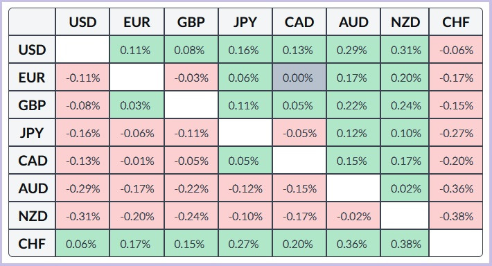 В таблице ниже представлено процентное изменение японской иены по отношению к основным валютам на сегодняшний день. Японская иена укрепилась по отношению к австралийскому доллару.