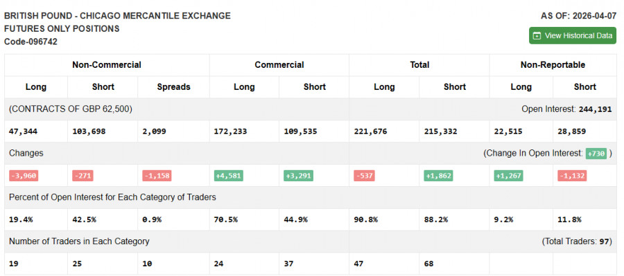 Прежде чем разбирать техническую картину фунта давайте посмотрим, что произошло на фьючерсном рынке. В COT-отчете (Commitment of Traders) за 7 апреля наблюдалось сокращение коротких и длинных позиций. Фунт день ото дня кидает в разные стороны, но в целом, ситуация на Ближнем Востоке продолжает сохранять спрос на рисковые активы, готовя трейдеров к завершению острой фазы военного конфликта между США, Израилем и Ираном. В последнем COT-отчете указано, что длинные некоммерческие позиции сократились на 3 960 до уровня 47 344, тогда как короткие некоммерческие упали на 271 до уровня 103 698. В итоге спрэд между длинными и короткими позициями сократился на 1 158.