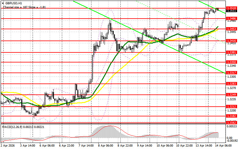 Несмотря на блокаду Ормузского пролива со стороны США и Ирана, а также провальные первые мирные переговоры этих сторон, режим прекращения огня сохраняется, что оказало вчера хорошую поддержку британскому фунту в паре с долларом. Сегодня ожидаются выступления губернатора Банка Англии Эндрю Бэйли и члена КМП Банка Англии Кэтрин Л. Манн. Заявления политиков могут привести к новой волне роста фунта. В случае обратной реакции, первого проявления покупателей жуд в районе поддержки 1.3486. Лишь формирование там ложного пробоя станет поводом на открытие длинных позиции с целью возврата GBP/USD к уровню 1.3518. Прорыв и обратный тест сверху вниз этого диапазона дадут шанс на дальнейшее укрепление GBP/USD, что приведет к новым покупкам и позволит добраться до 1.3542. В случае выхода выше и этого диапазона можно говорить о рывке к 1.3572, где собираюсь фиксировать прибыль. При сценарии падения GBP/USD и отсутствия покупателей в районе уровня 1.3486, медведи попытаются добиться новой крупной распродажи. Это также приведет к снижению в район следующей поддержки 1.3453. Формирование там ложного пробоя будет подходящим вариантом по входу в рынок. Открывать длинные позиции по GBP/USD сразу на отскок можно от 1.3416 с целью коррекции в 30-35 пунктов внутри дня.