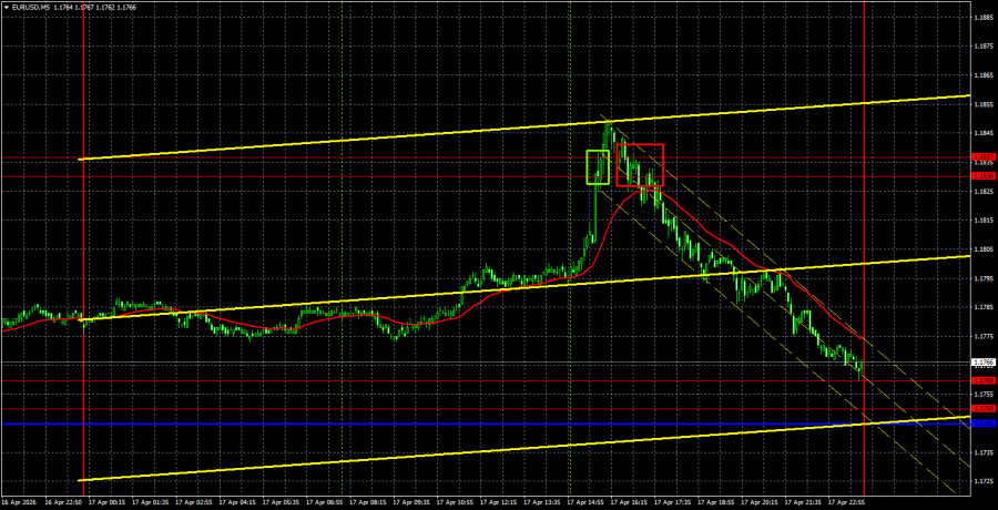 Анализ EUR/USD 5M. Валютная пара EUR/USD в пятницу двигалась в абсолютно закономерном направлении до самого вечера. В первой половине дня на фоне полного отсутствия макроэкономической и фундаментальной информации волатильность была на нуле, а движение боковое. Ближе к вечеру поступила информация об открытии Ормузского пролива, что спровоцировало падение доллара США. А под занавес дня и недели пара обвалилась на 90 пунктов, чему нет на первый взгляд логического объяснения. Тем не менее, мы можем предположить, что рынок исчерпал позитив