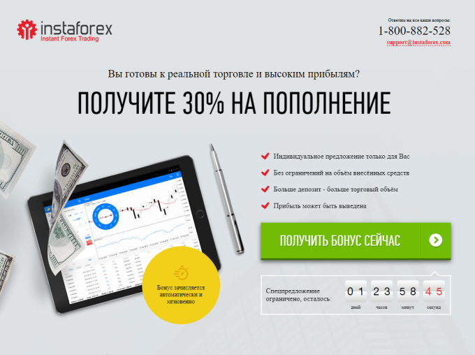 InstaForex mijozlari uchun eng qulay taklif. Hisobni to’ldiring va to’ldirilgan miqdorga +30% oling. Oshirilgan depozit sifatida sotib olish uchun katta buyurtma bermoq imkonini beradi. Bonus cheklangandan so’ng biron qanday miqdorga va cheklovlar yo’q.