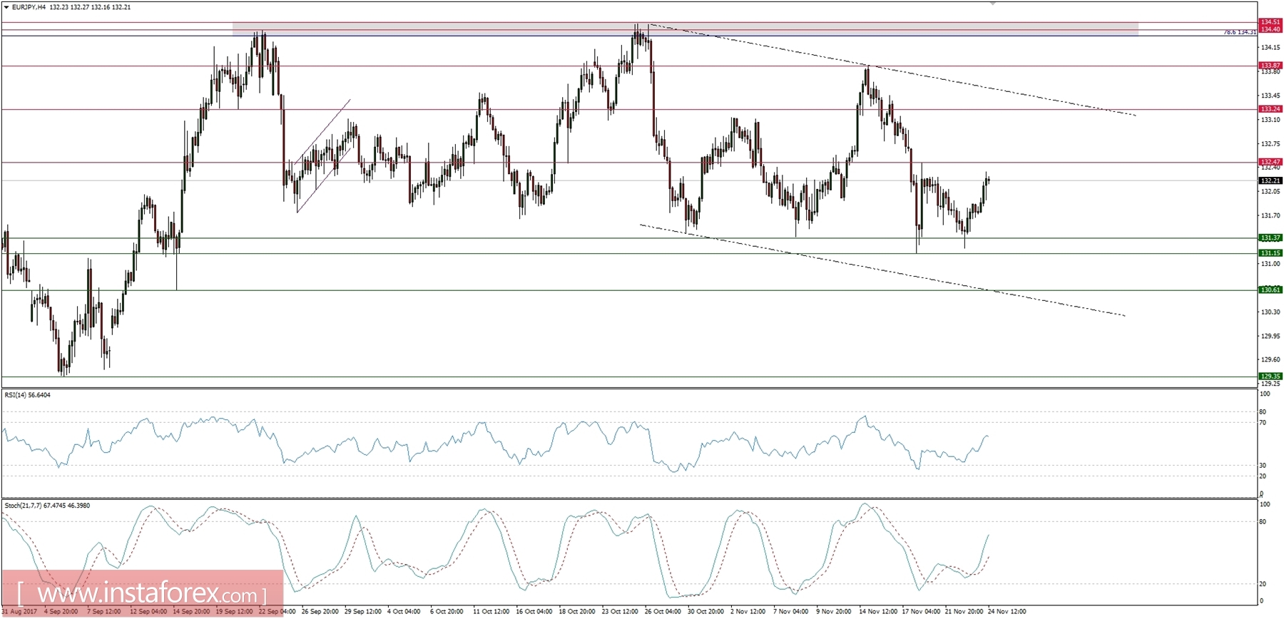 Let's now take a look at the EUR/JPY technical picture at the H4 time frame. The market is still locked in a horizontal area between two important zones: 131.15 - 131.37 (support) and 134.40 - 134. 51 (resistance). As long as one of this level is clearly violated, the sideways move will continue. The larger time frame trend remains bullish.
