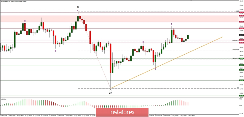 The ETH/USD pair has tested the technical support located at the level of 165.45 and bounced off it again. The bounce is quite shallow for now because the recent local high at the level of 172.00 ha snot been violated yet, as per the Elliott wave scenario. The top of the wave c might be now in place, but to confirm this, the bears must push the price below the level of 165.46 so the sell-off could accelerate.