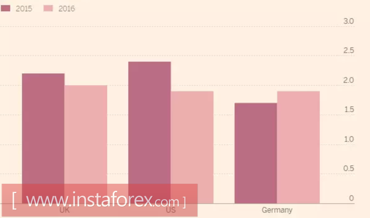 Экономика Британии выросла на 0,6% кв/кв и на 2% за год, несколько замедлившись по сравнению с 2015 (+2,2%), однако сохраняя прекрасную форму на фоне Brexit. Она является самой быстрорастущей среди стран G7. В частности, ВВП США в 2016 замедлился до пятилетнего дна 1,9%, а ВВП Германии, напротив, ускорился до максимальной отметки за последние 5 лет (1,9%).