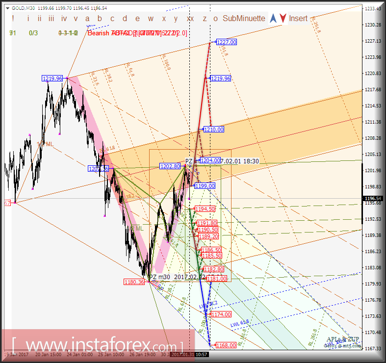 Развитие движения цены инструмента (Gold Spot) в период 31 января - 02 февраля 2017 г. будет обусловлено отработкой нижней границы ISL38.2 (уровень сопротивления 1199.00) зоны равновесия вил операционного масштаба SubMinuette и верхней границы (уровень поддержки 1194.50) канала 1/2 Median Line SubMinuette.