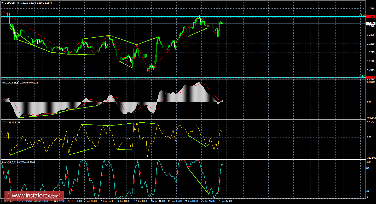 Без образования бычьей дивергенции на 4-часовом графике пара выполнила разворот в пользу английского фунта и начала процесс возврата к уровню коррекции 200,0% - 1,2652. Назревающих дивергенций 1 февраля не видно. Отбой котировок от уровня Фибо 200,0% позволит трейдерам рассчитывать на разворот в пользу доллара США и некоторое падение в направлении коррекционного уровня 261,8% - 1,1926. Закрепление пары над уровнем Фибо 200,0% повысит вероятность продолжения роста в направлении следующего уровня коррекции 161,8% - 1,3106.