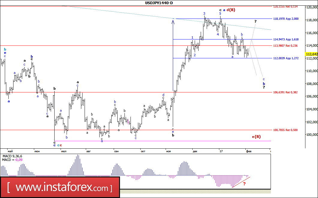 В целом ожидаемо, минувшую неделю пара USD/JPY начала с нисходящего движения и после потери около 270 п.п. остановилась в четверг перед уровнем 112-й фигуры. При этом можно предположить, что валютная пара предприняла попытку завершить волну b, в b, в d, в (В) и продолжить формирование волны с, в этой b, в d, в (В), или даже в е, в (В). Если это так, то, несмотря на текущее положение MACD_ака, валютная пара может продолжить обозначившееся снижение котировок в направлении уровня 109,00.
