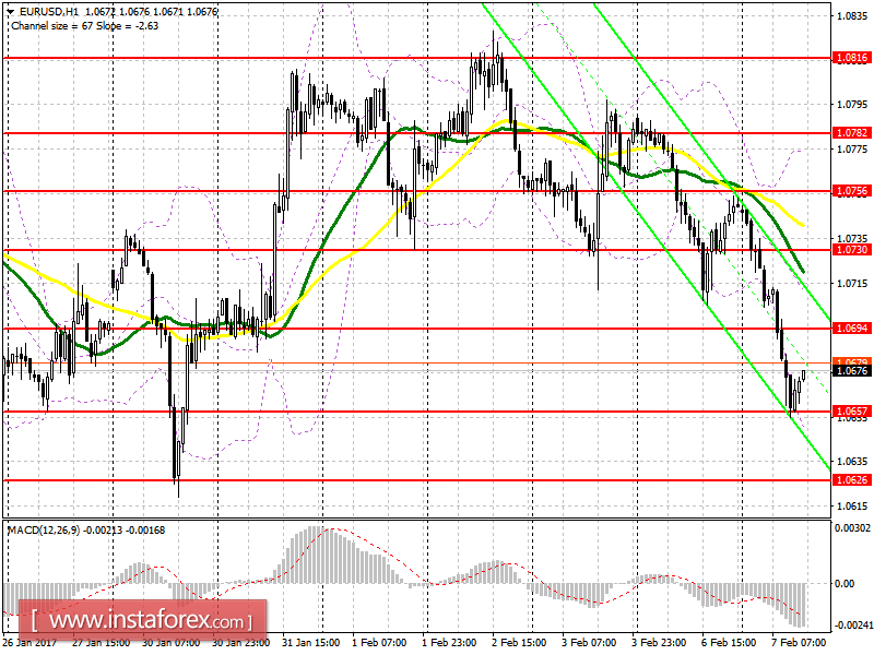 Продавцы сегодня проделали очень большой путь, и небольшая восходящая коррекция просто необходима. Короткие позиции по евро могут увеличиться после повторного возврата к 1.0657 уже на американской сессии, либо после роста к 1.0694. Пробой 1.0657 откроет хорошую возможность к спуску EUR/USD в диапазон новой поддержки 1.0626, где вновь советую фиксировать прибыль.