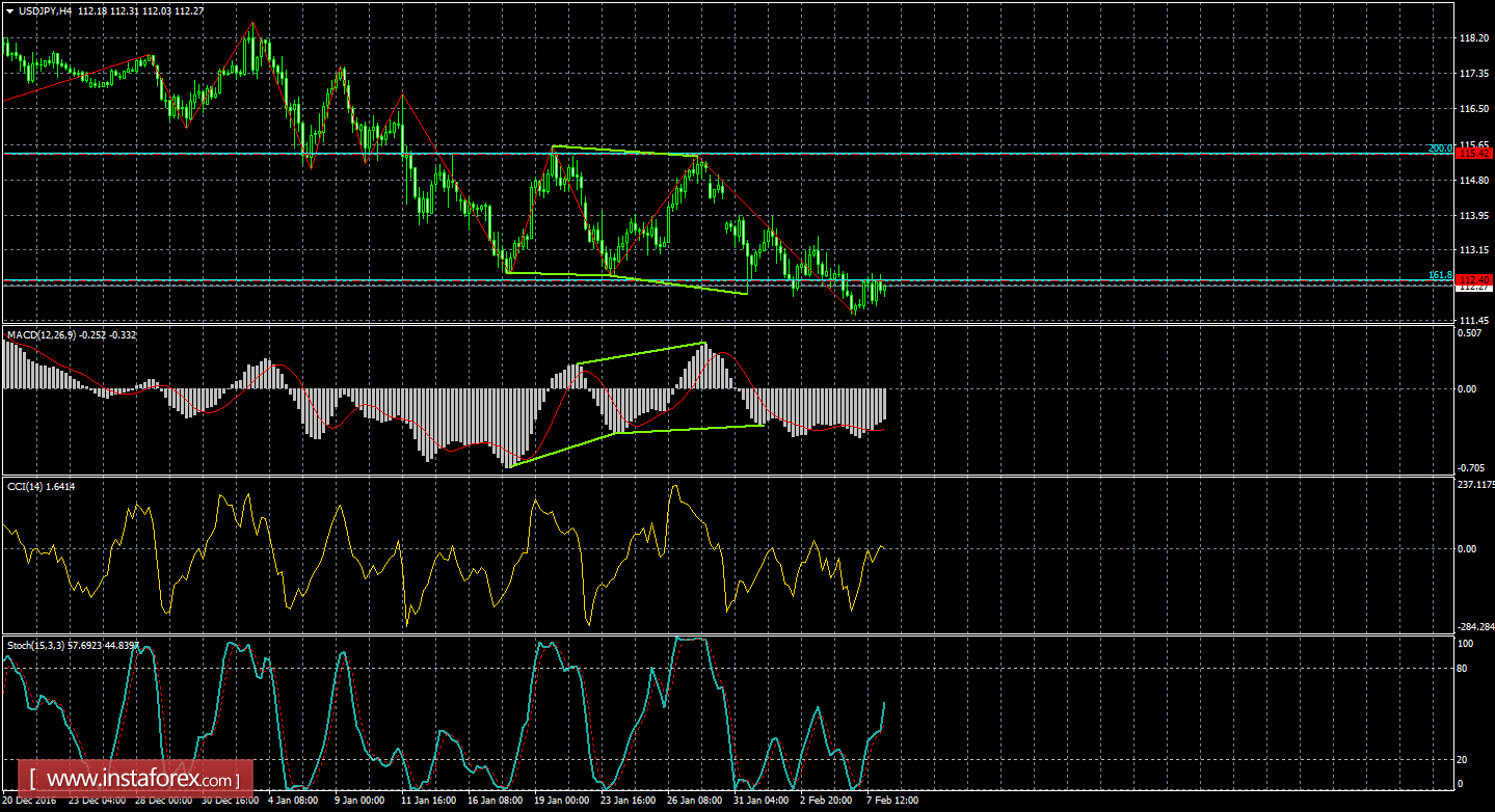 На 4-часовом графике котировки пары выполнили закрепление под уровнем Фибо 161,8% - 112,40. В итоге процесс падения пары может быть продолжен в направлении следующего уровня коррекции 100,0% - 107,52. Ни одной назревающей дивергенции 8 февраля не видно. Закрепление курса пары над уровнем коррекции 161,8% позволит трейдерам ожидать разворот в пользу американского доллара и некоторый рост в направлении коррекционного уровня 200,0% - 115,42.