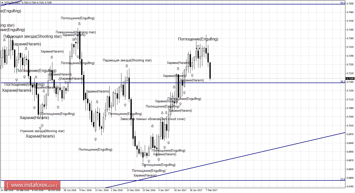 Сразу две сильные медвежьи формации - «Падающая звезда» и «Поглощение» - сработали на 4-часовом графике в пользу американской валюты. В итоге пара выполнила закрепление под уровнем Фибо 61,8% - 0,7246 и продолжает процесс падения в направлении коррекционного уровня 50,0% - 0,7173. Отбой котировок 9 февраля от уровня Фибо 50,0% позволит ожидать разворот в пользу новозеландской валюты и некоторый рост в направлении уровня коррекции 61,8%. Образование бычьей свечной формации аналогично сработает в пользу начала роста котировок. Закрепление курса пары под уровнем Фибо 50,0% повысит вероятность продолжения падения в направлении коррекционного уровня 38,2% - 0,7099.