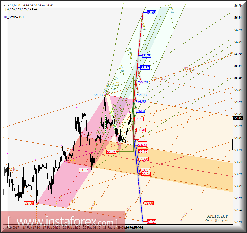 Развитие движения цены инструмента (#CL) в период 27_28 февраля 2017 г. будет обусловлено отработкой границ каналов 1/2 Median Line вил операционных масштабов -> Micro (54.43 <-> 54.60 <-> 54.80) и SubMinuette (54.43 <-> 54.20 <-> 54.00).